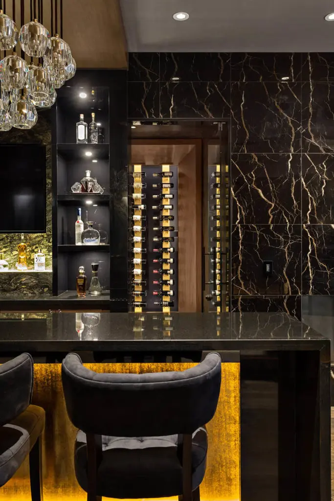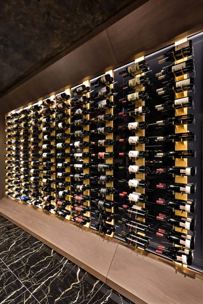 A stunning property showcasing attention to detail in every regard, the estate is surely one of the most outstanding examples of luxury design to grace the Vancouver residential landscape. Liquid Systems wine racks were used for the adjacent room which is hinted at from the perspective of the bar. The use of our anodized gold classic wall mounted series against a dark backdrop lived up to a stunning effect. Congratulations again to all those involved in this project.
